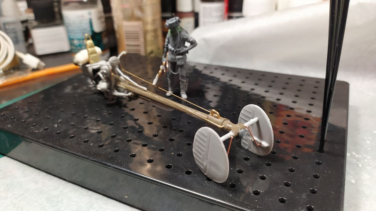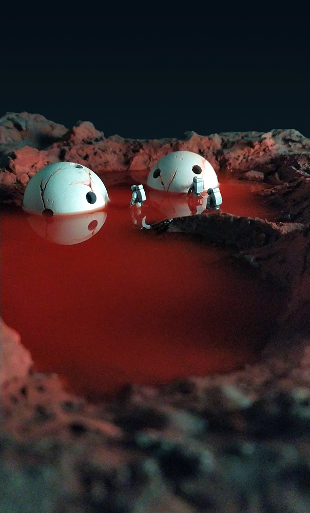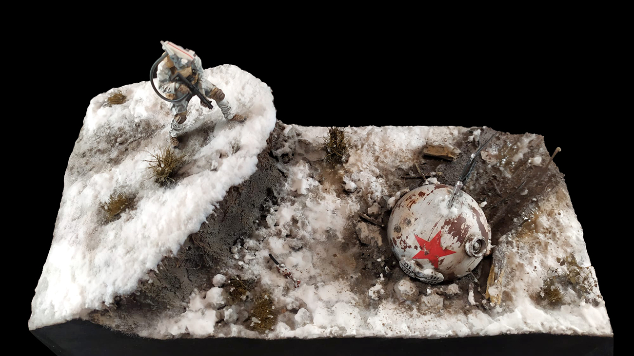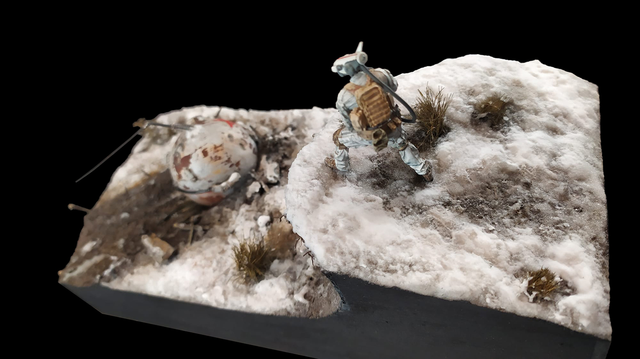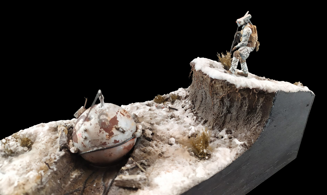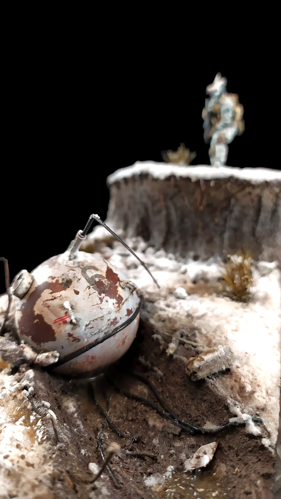 | 1/35 scale scifi scene. Made with spare parts, plastic and a table tennis ball. |