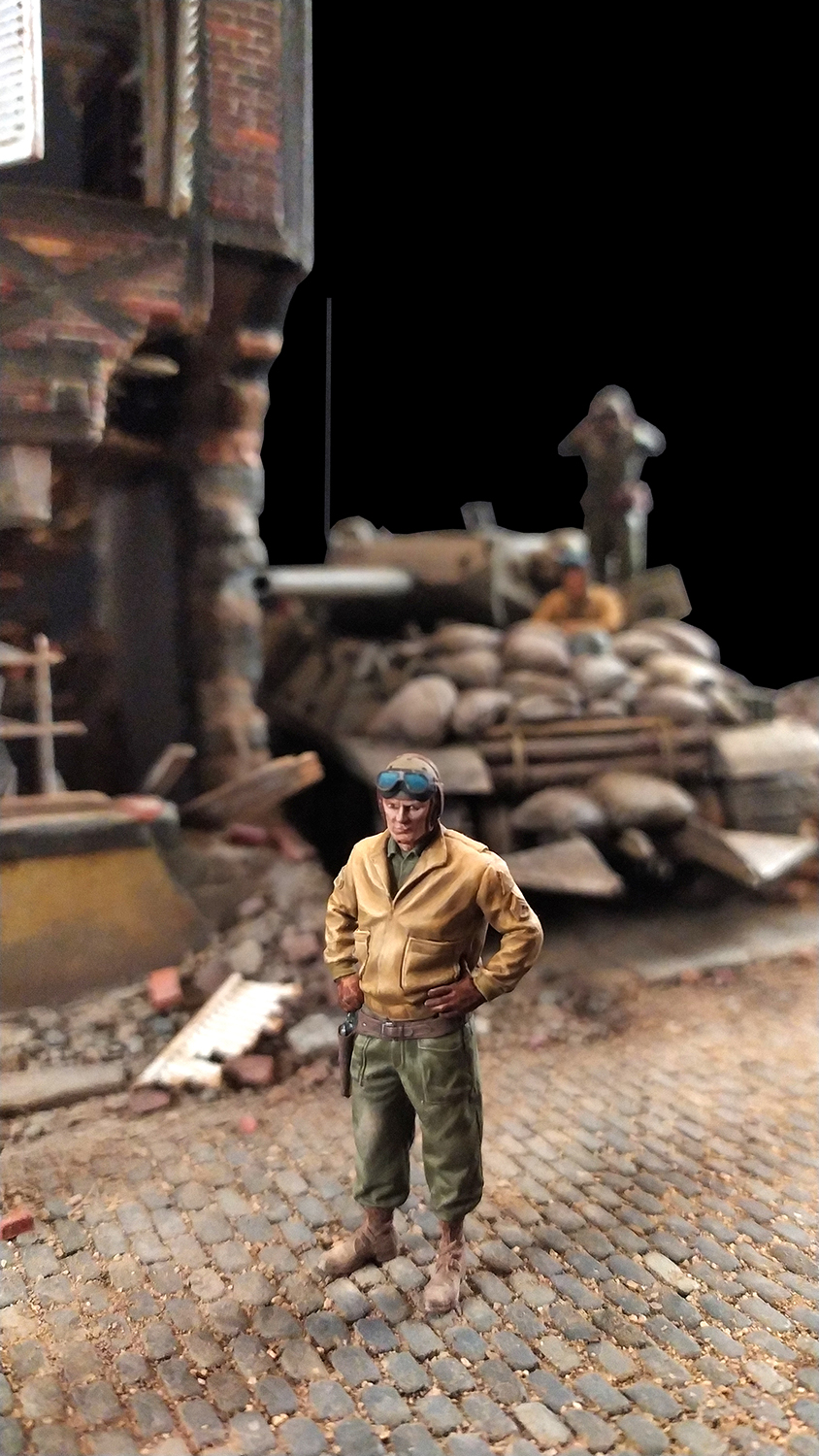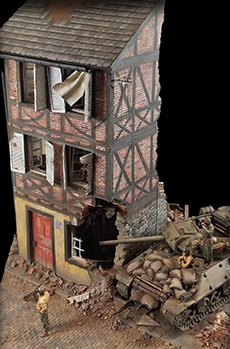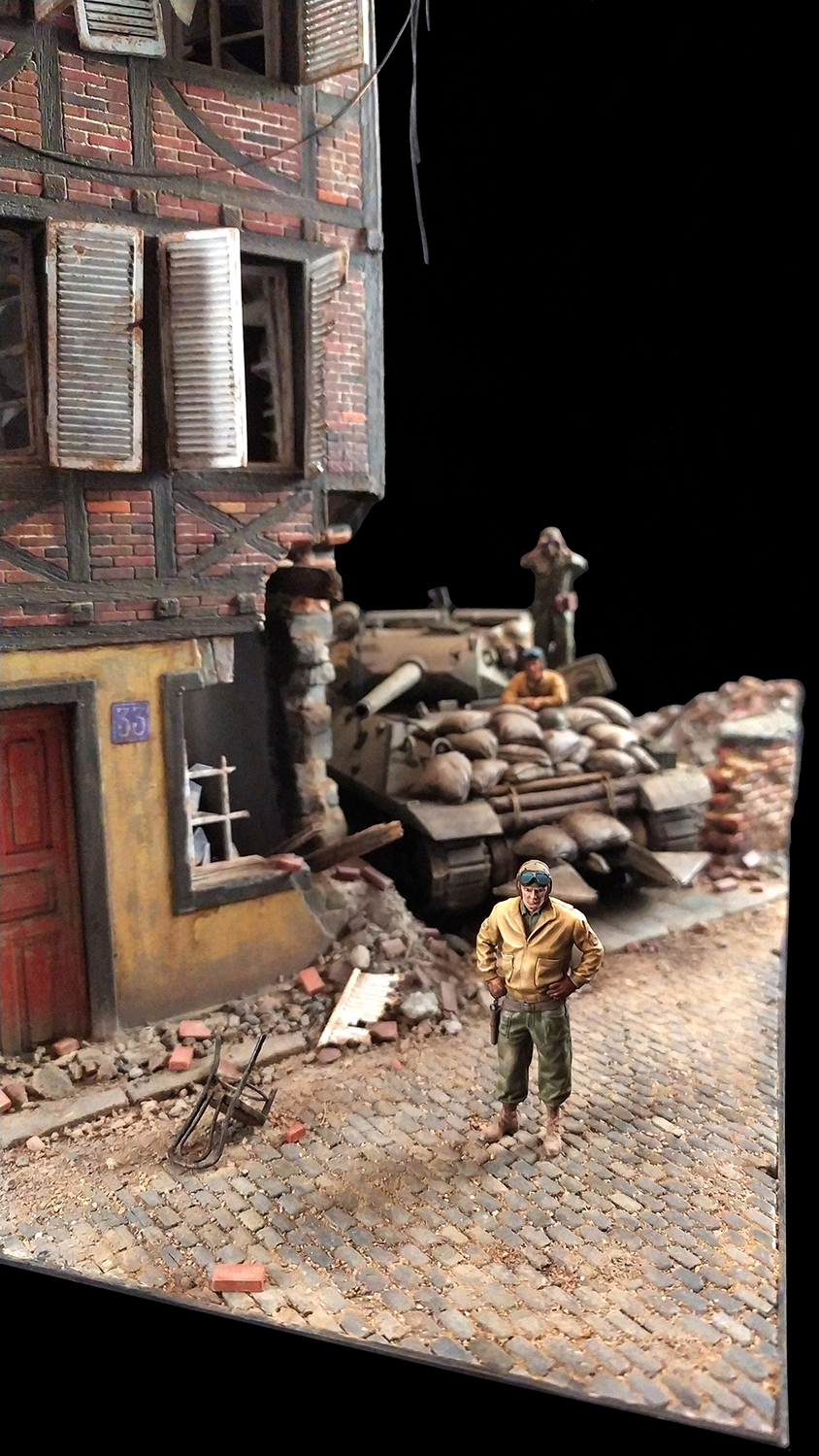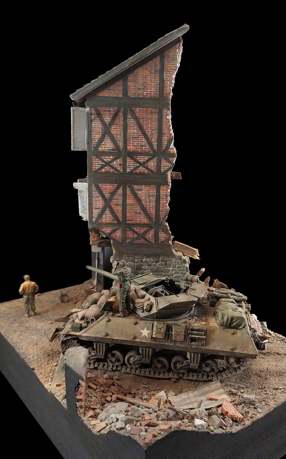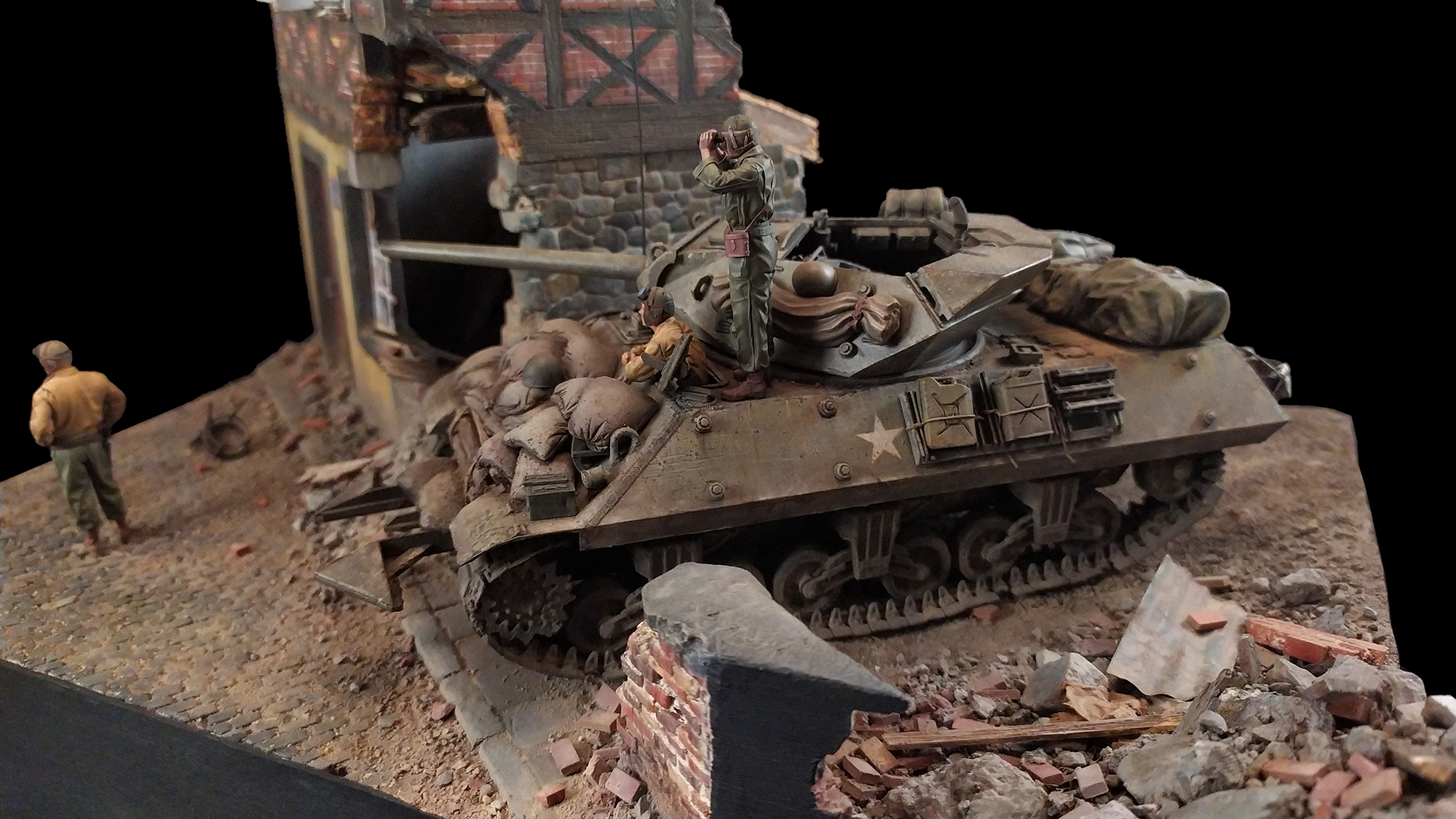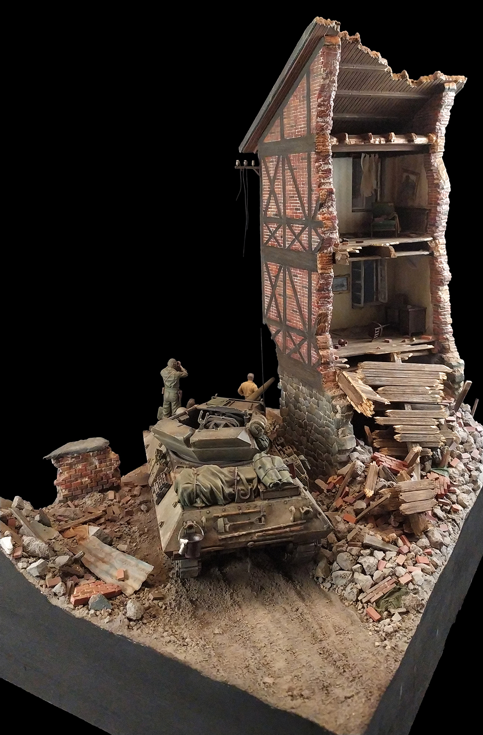 | Academy M10 tank destroyer. Miniart Normandy city building. Panzer Art and Tamiya figures. 1/35 scale |
