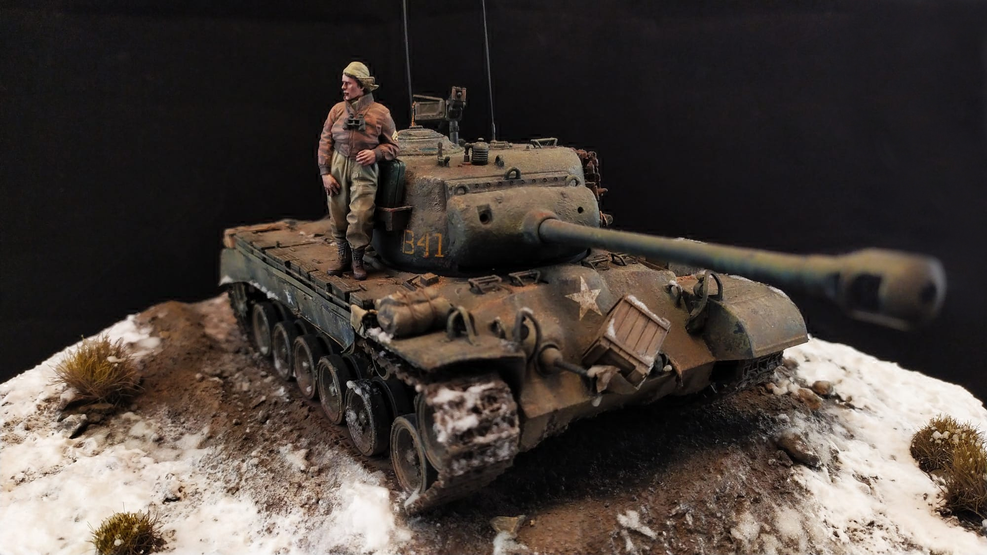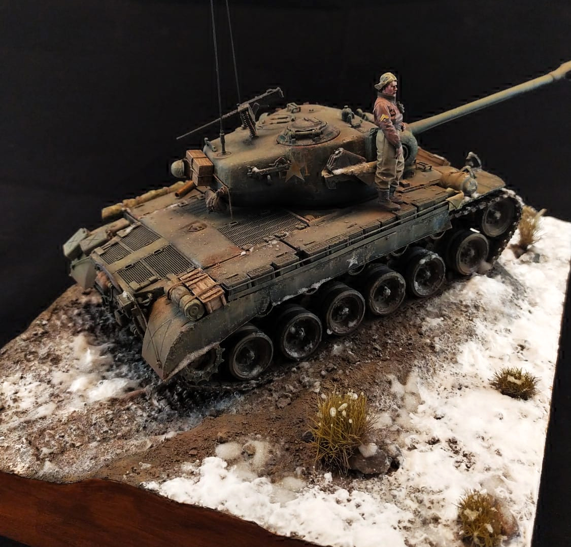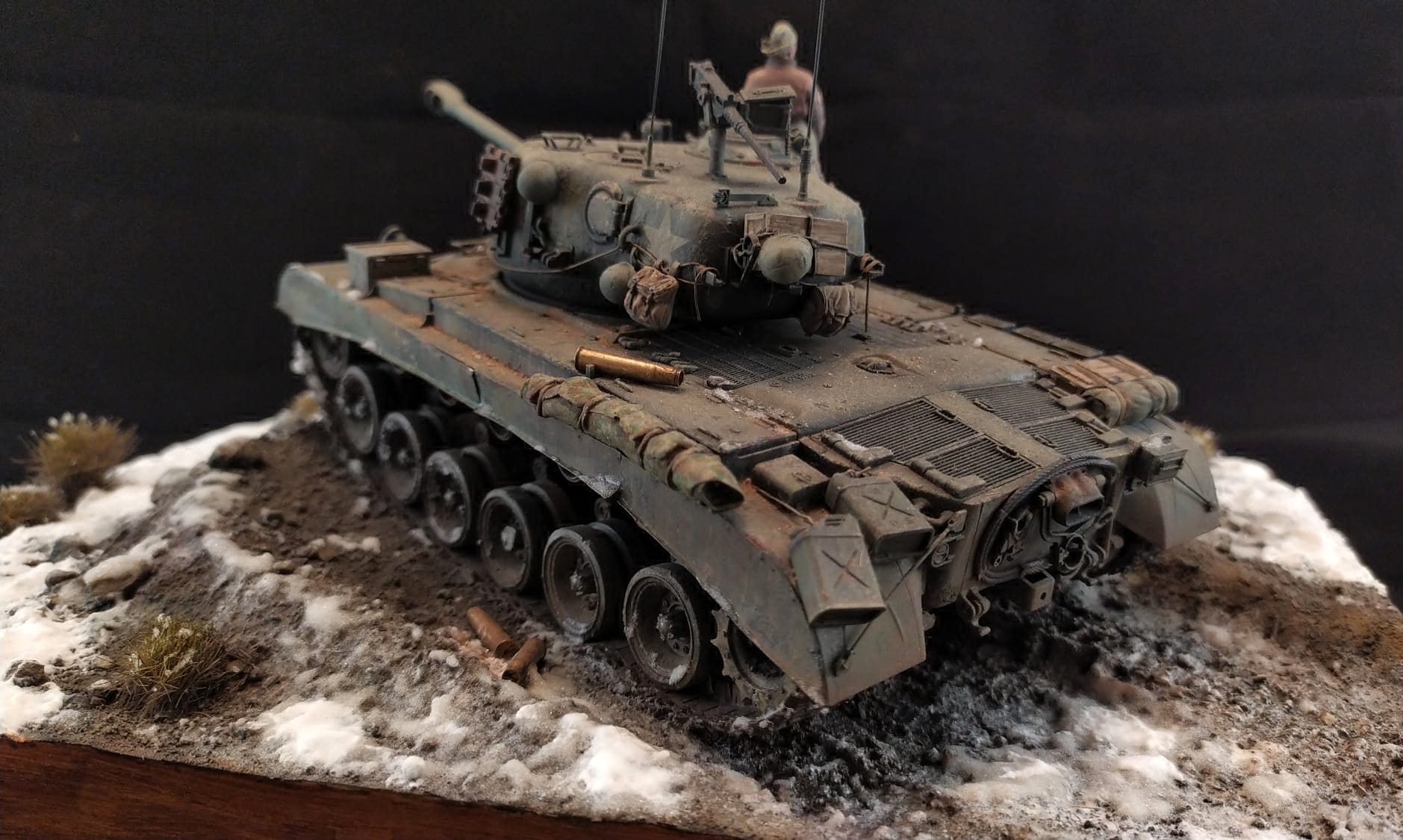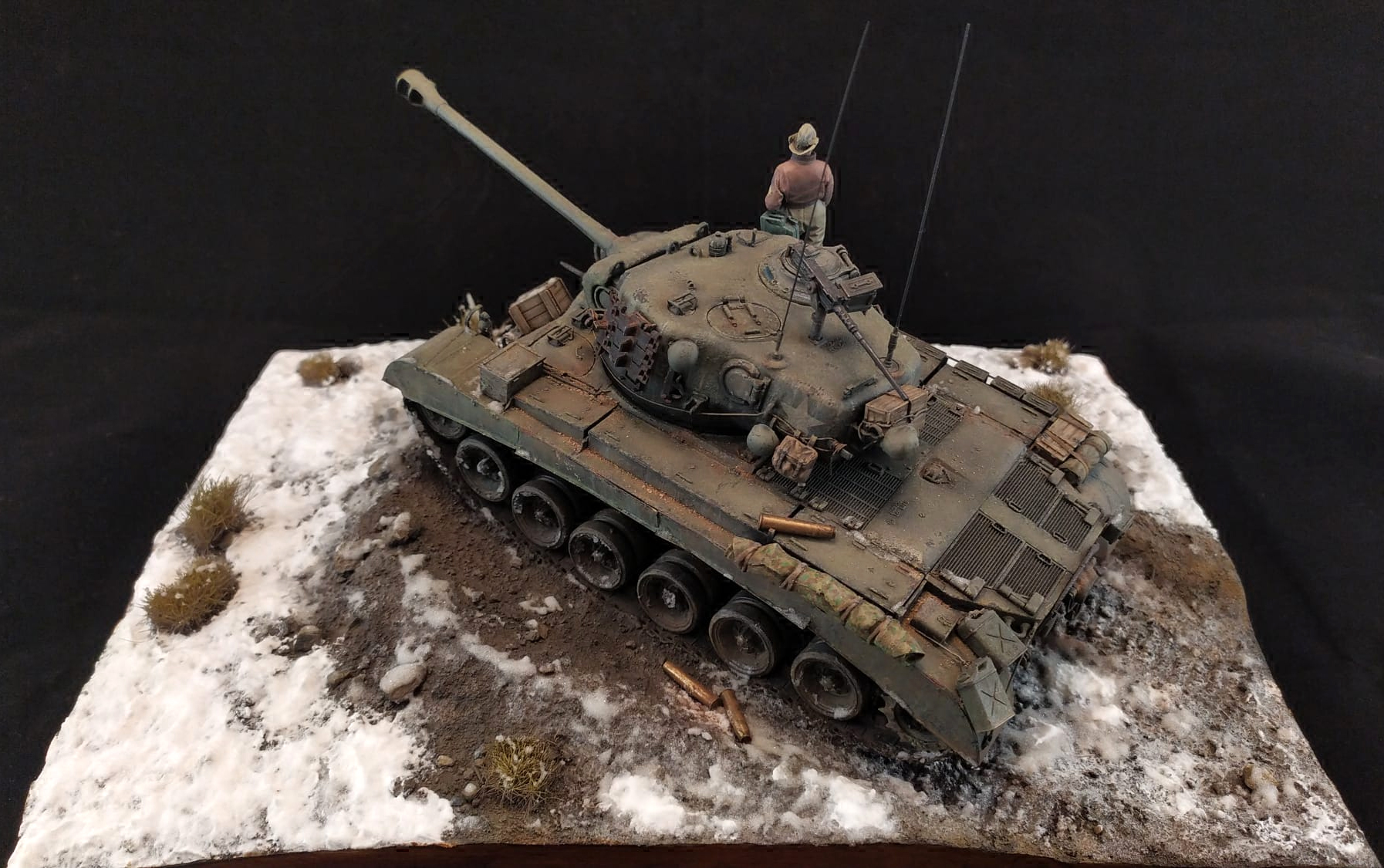 | Korean War winter scene. 1/35 scale Tamiya model kit with some custom improvements. Metal chains and an Alpine figure. |