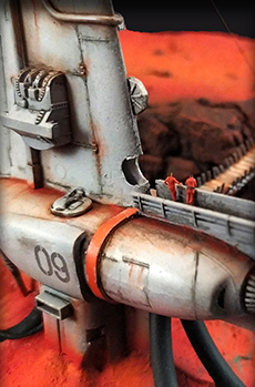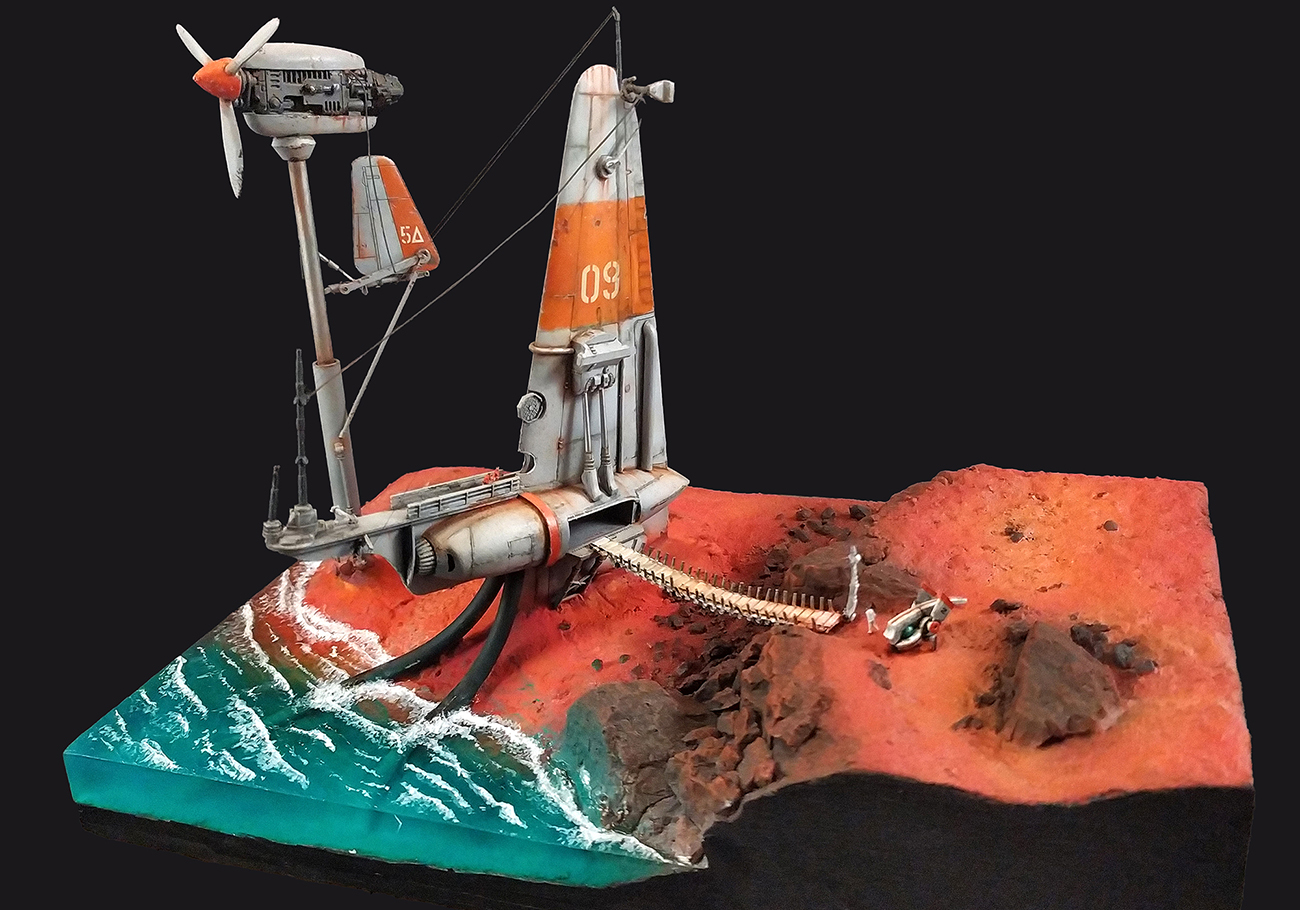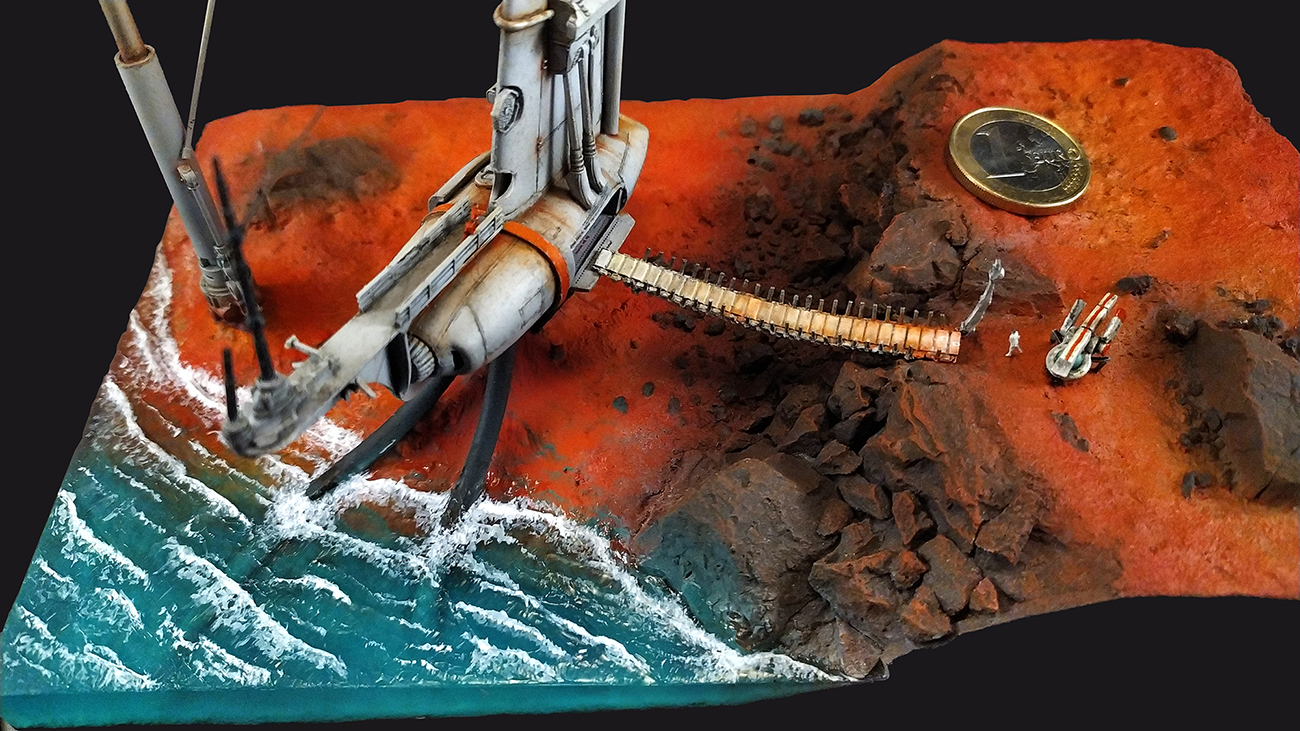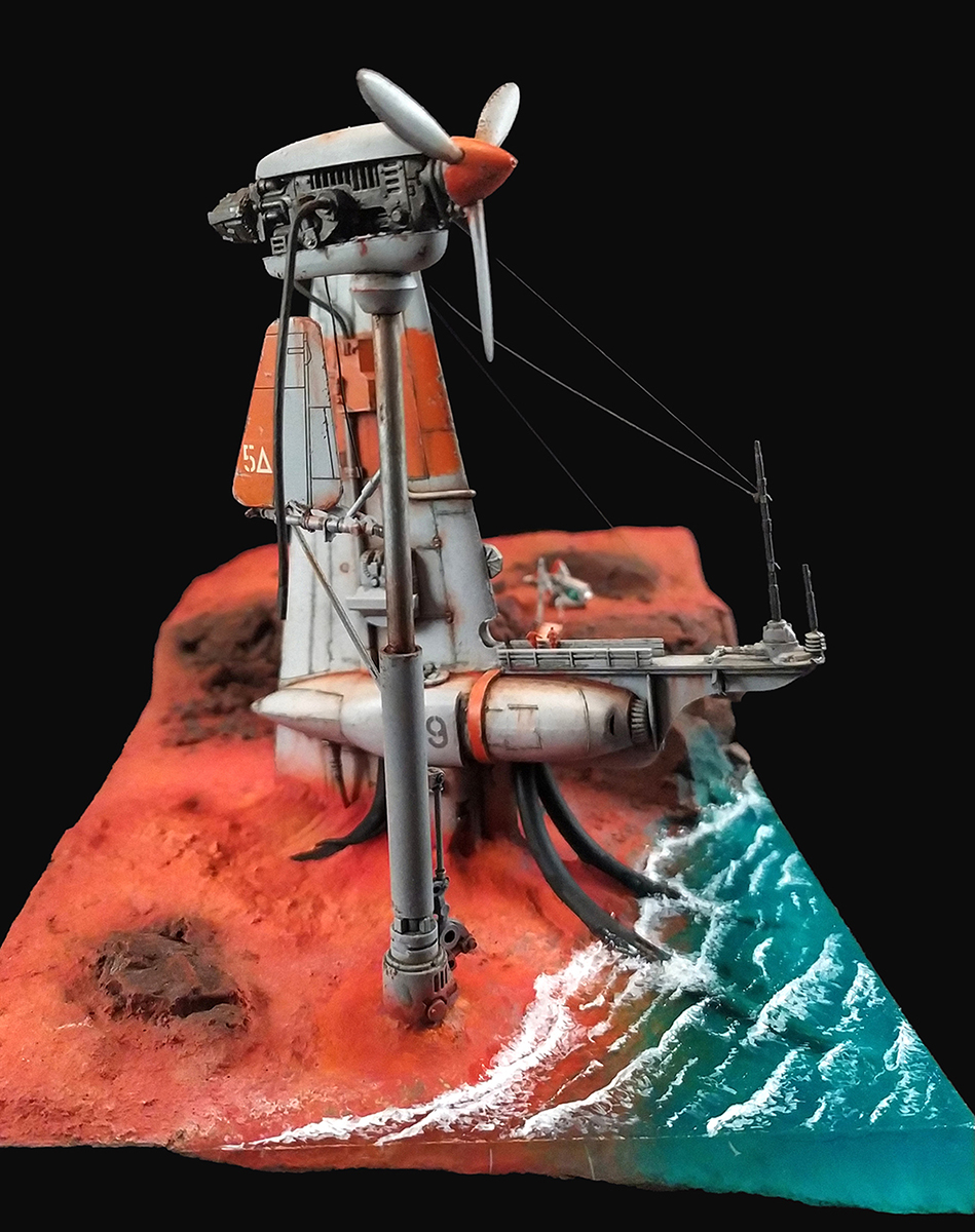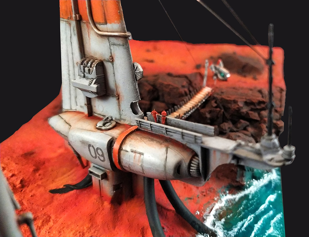 | SciFi diorama created with spare parts from several model kits, styrene and broken toys. 1/350 scale. |