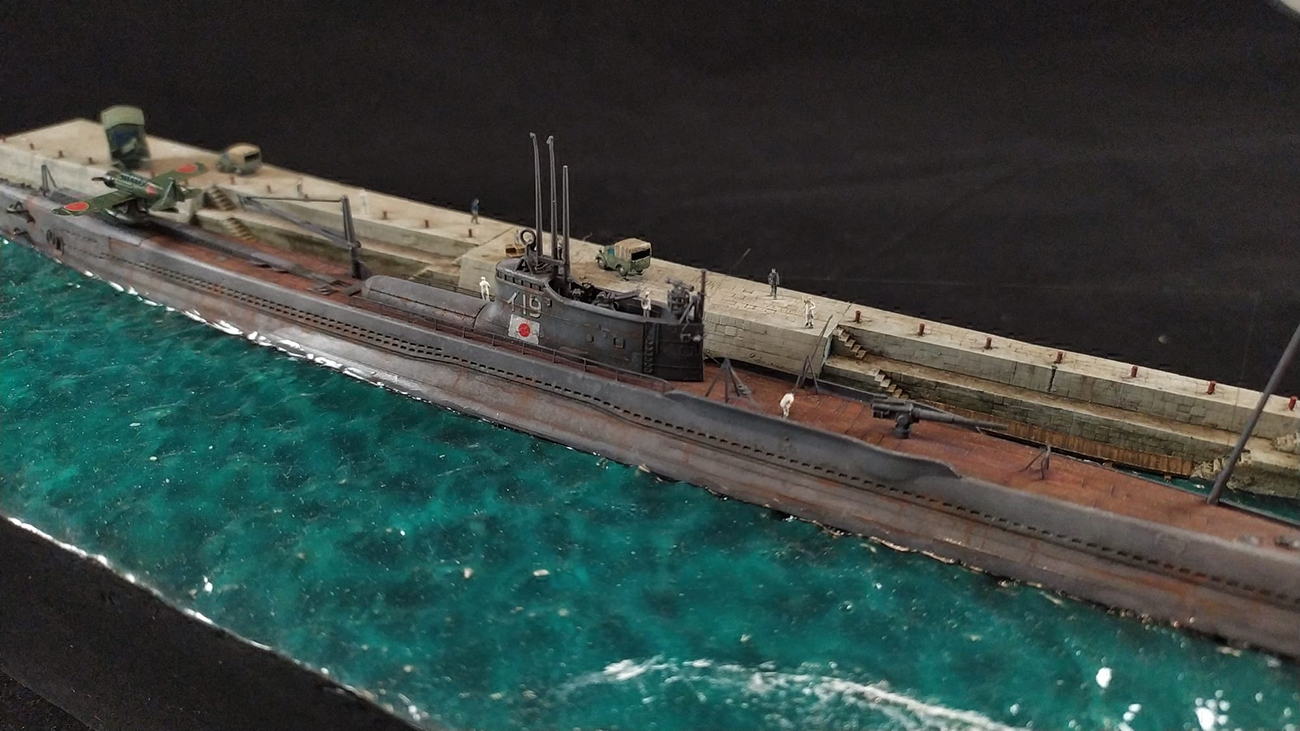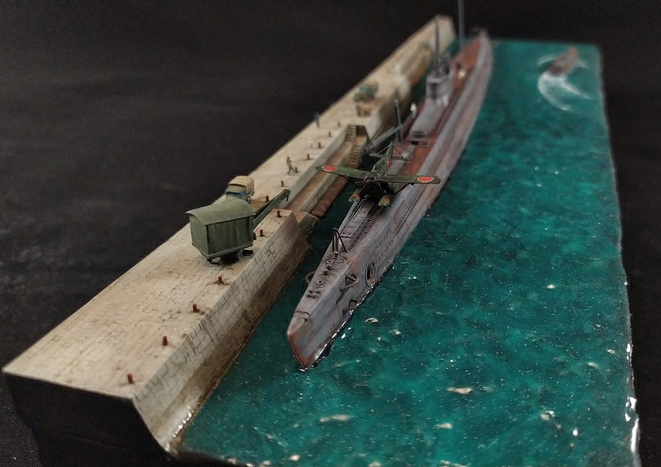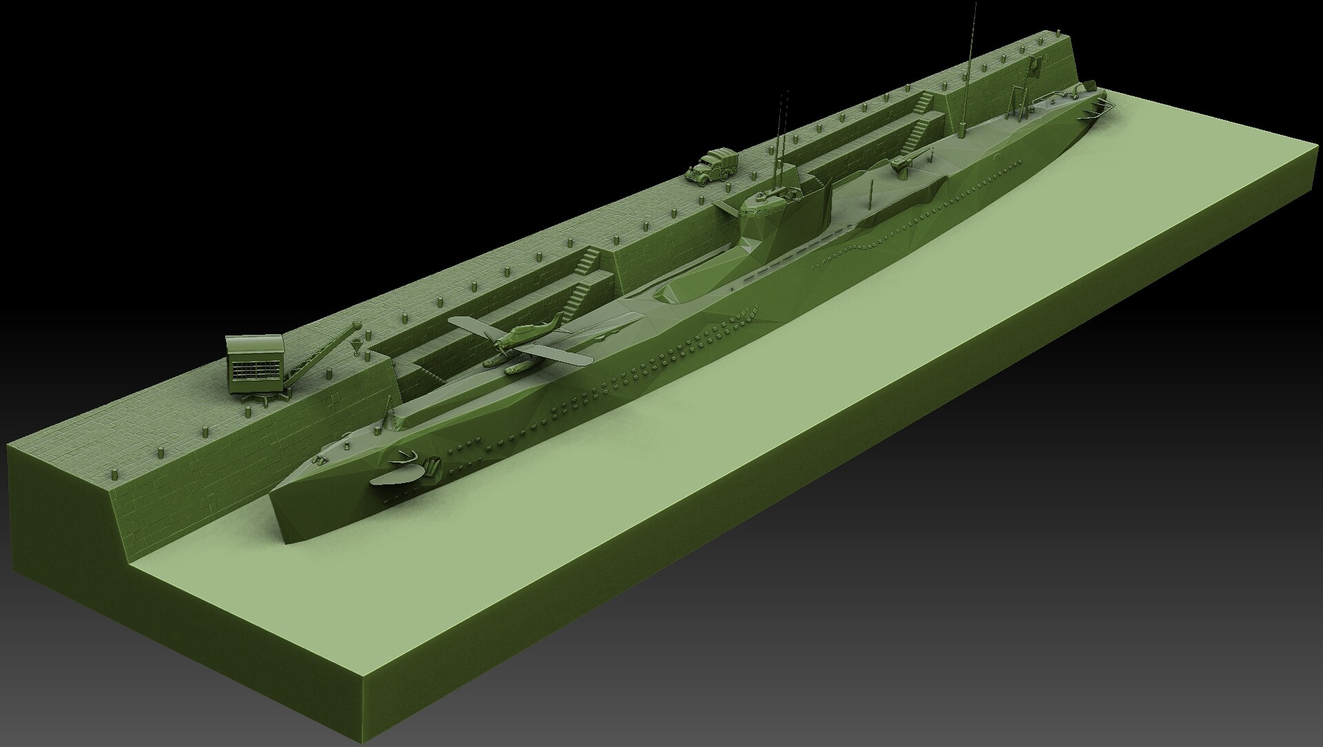 | I-19 Japanese submarine. AFV Club model kit. 1/350 scale. All the rest, figures, truck and dock were modeled using Zbrush and 3D printed. The crane was made using tin and styrene sheet. |