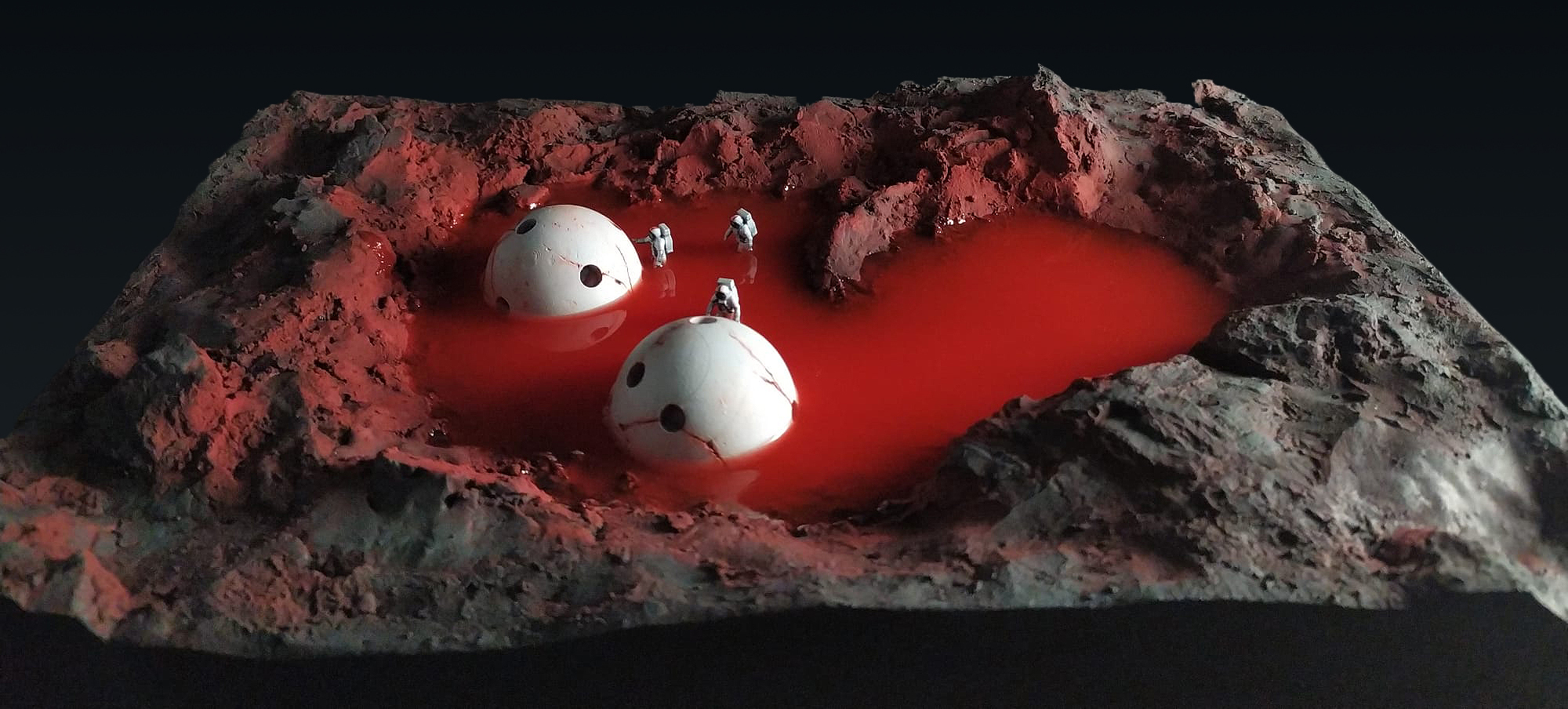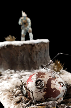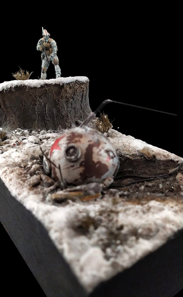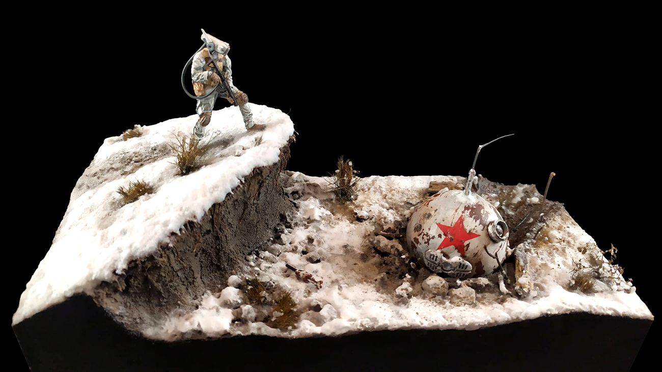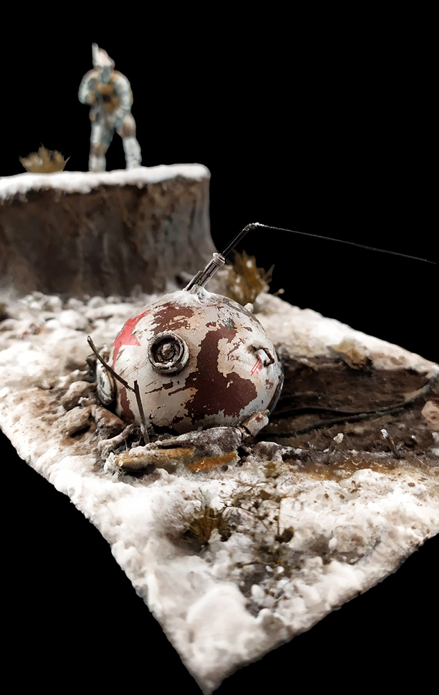 | 1/35 scale scifi scene. Made with spare parts, plastic and a table tennis ball. |