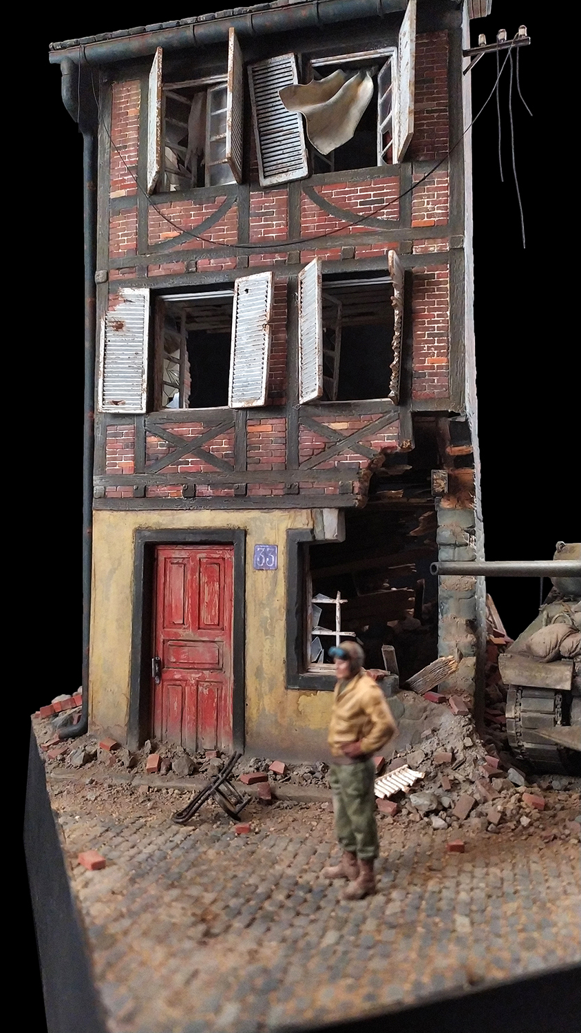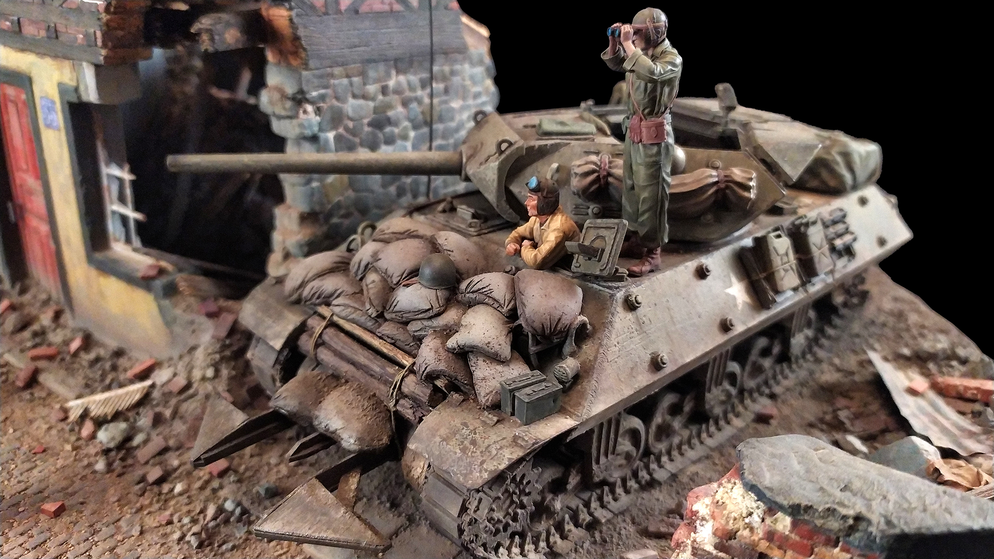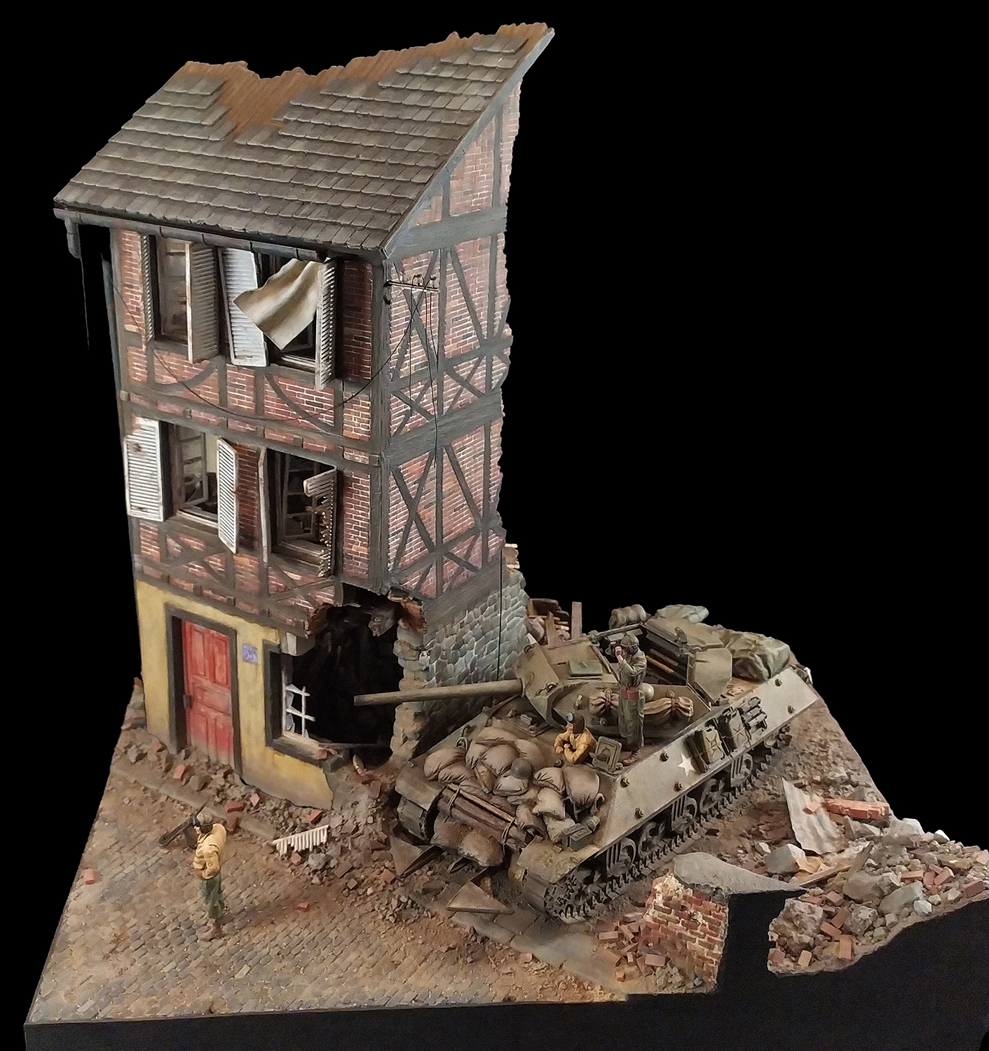 | Academy M10 tank destroyer. Miniart Normandy city building. Panzer Art and Tamiya figures. 1/35 scale |