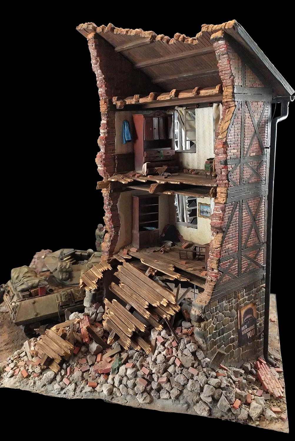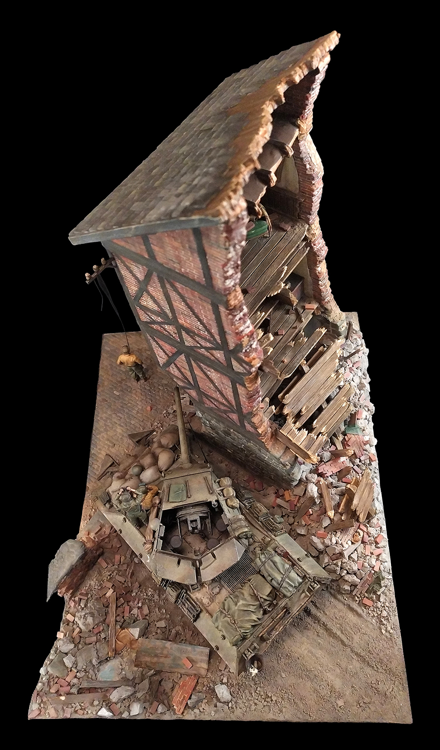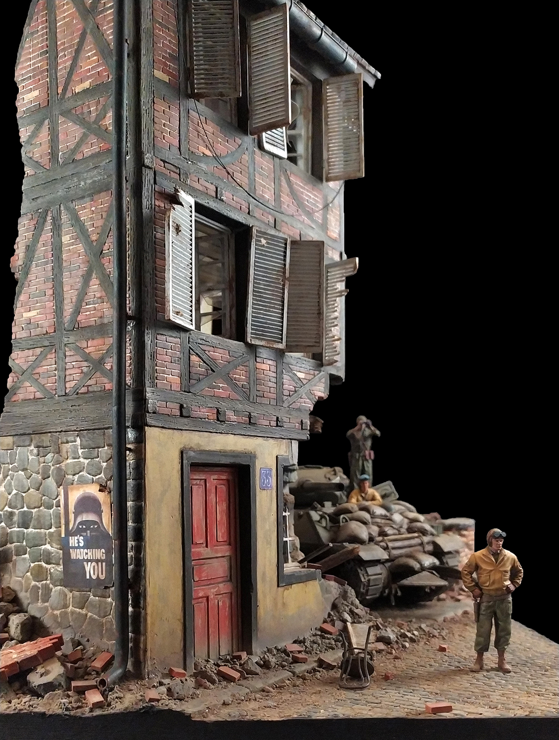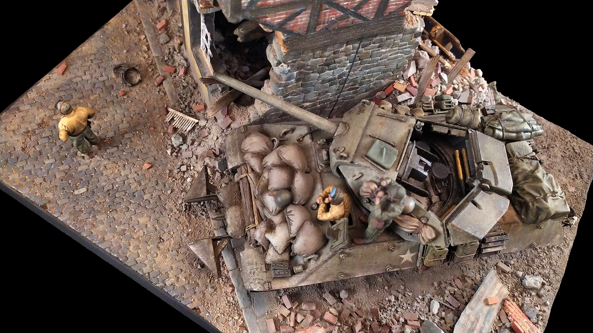 | Academy M10 tank destroyer. Miniart Normandy city building. Panzer Art and Tamiya figures. 1/35 scale |
