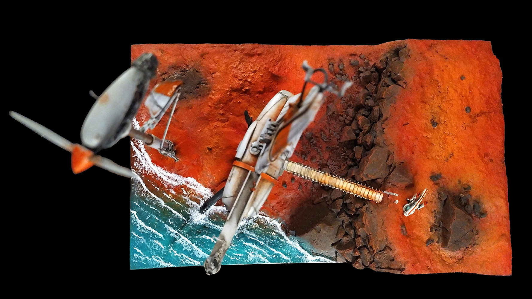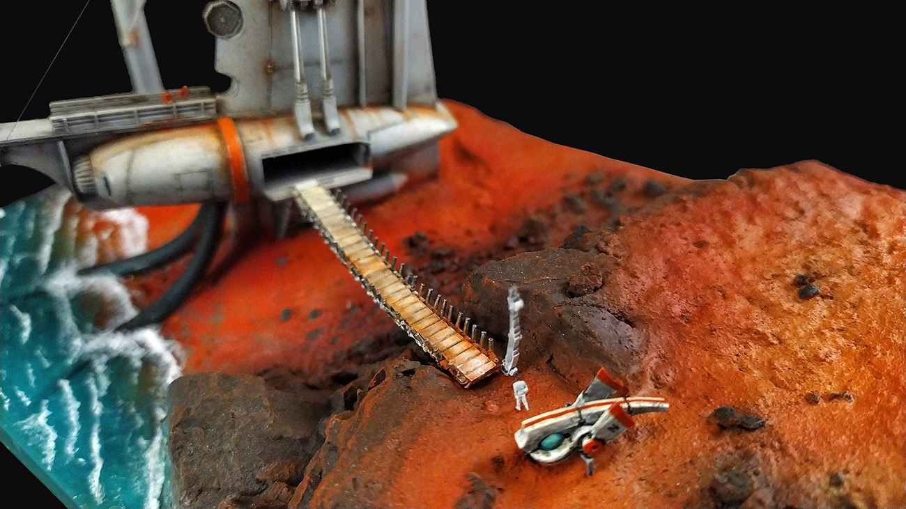 | SciFi diorama created with spare parts from several model kits, styrene and broken toys. 1/350 scale. |