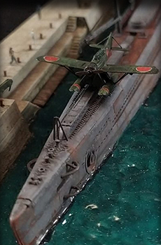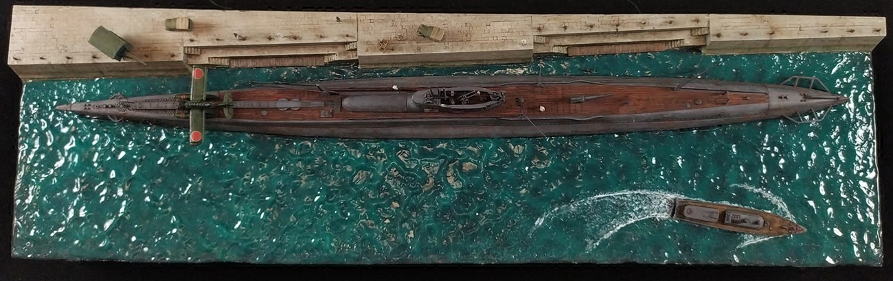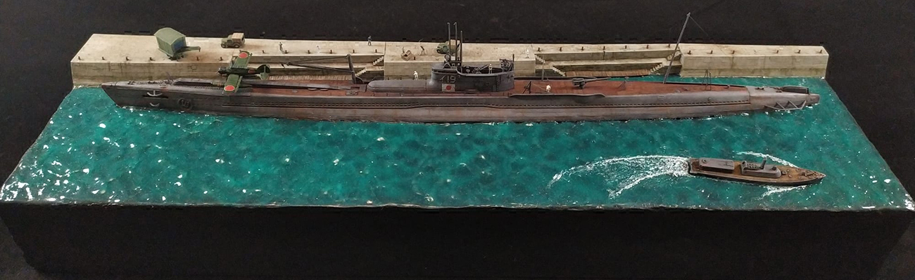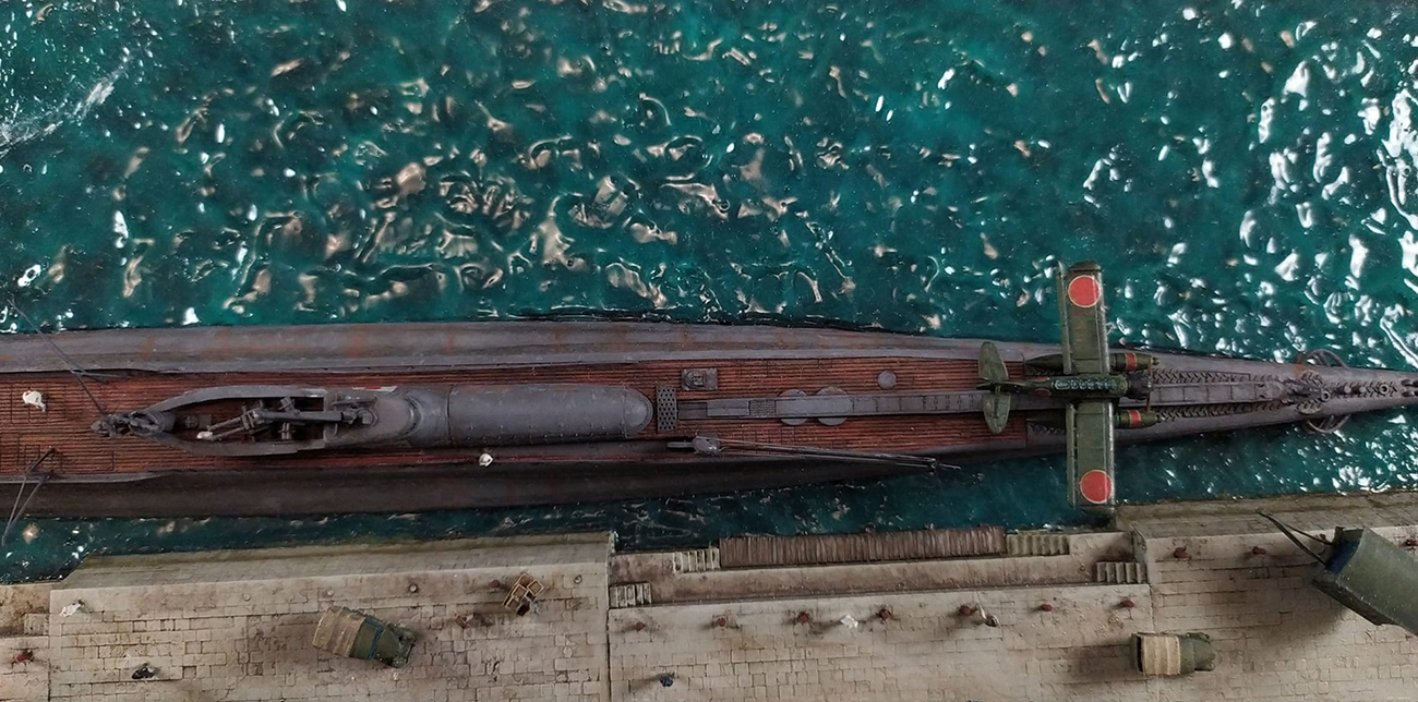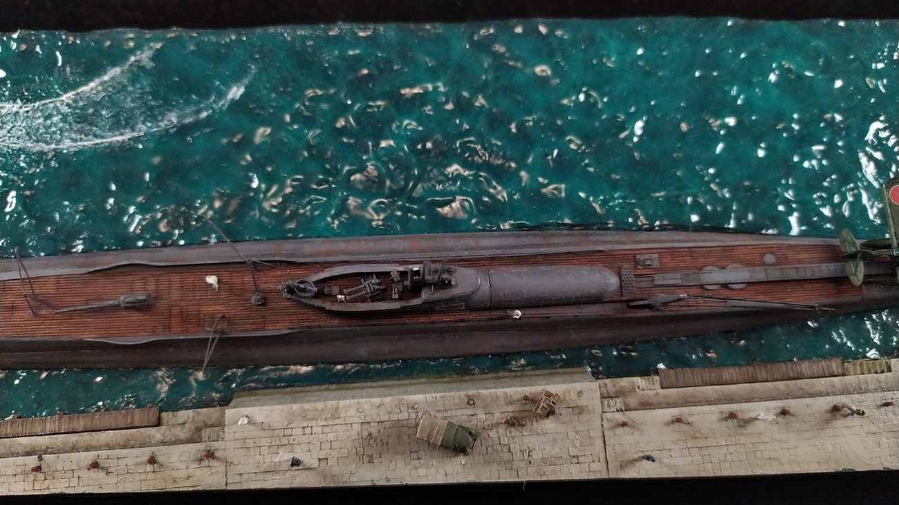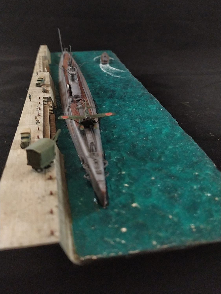 | I-19 Japanese submarine. AFV Club model kit. 1/350 scale. All the rest, figures, truck and dock were modeled using Zbrush and 3D printed. The crane was made using tin and styrene sheet. |